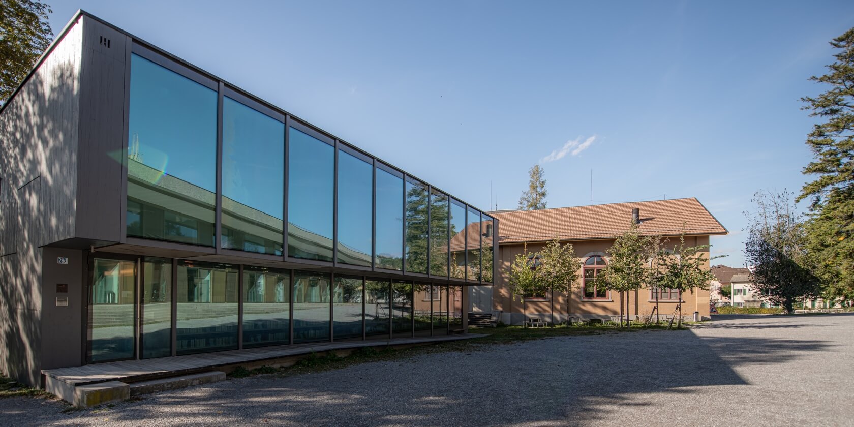 Der 1999 vom Erlenbacher Architekturbüro Bétrix und Consolascio erstellte Holz- und Glasbau besticht durch seine Einheit von Form und Inhalt. Auch wenn in dieser Mediothek die elektronischen Medien eine wichtige Rolle spielen, so führen architektonisch doch die Bücherregale Regie. Sie sind keine Möbel, sondern bilden die tragenden Elemente des Gebäudes, sie sind das Haus. Die räumliche Stimmung erinnert eher an klassische Bibliotheken, wie sie beispielsweise in Klöstern anzutreffen sind, als an konventionelle, meistens durch Regale verstellte Schulbibliotheken. Der lichte Innenraum macht erfahrbar, wie erholsam Vertiefung und Konzentration sein können. Beim Lesen oder Entspannen fällt der Blick durch die Bücherregale hinaus auf die vielfältige Umgebung des preisgekrönten Minergie-Baus.