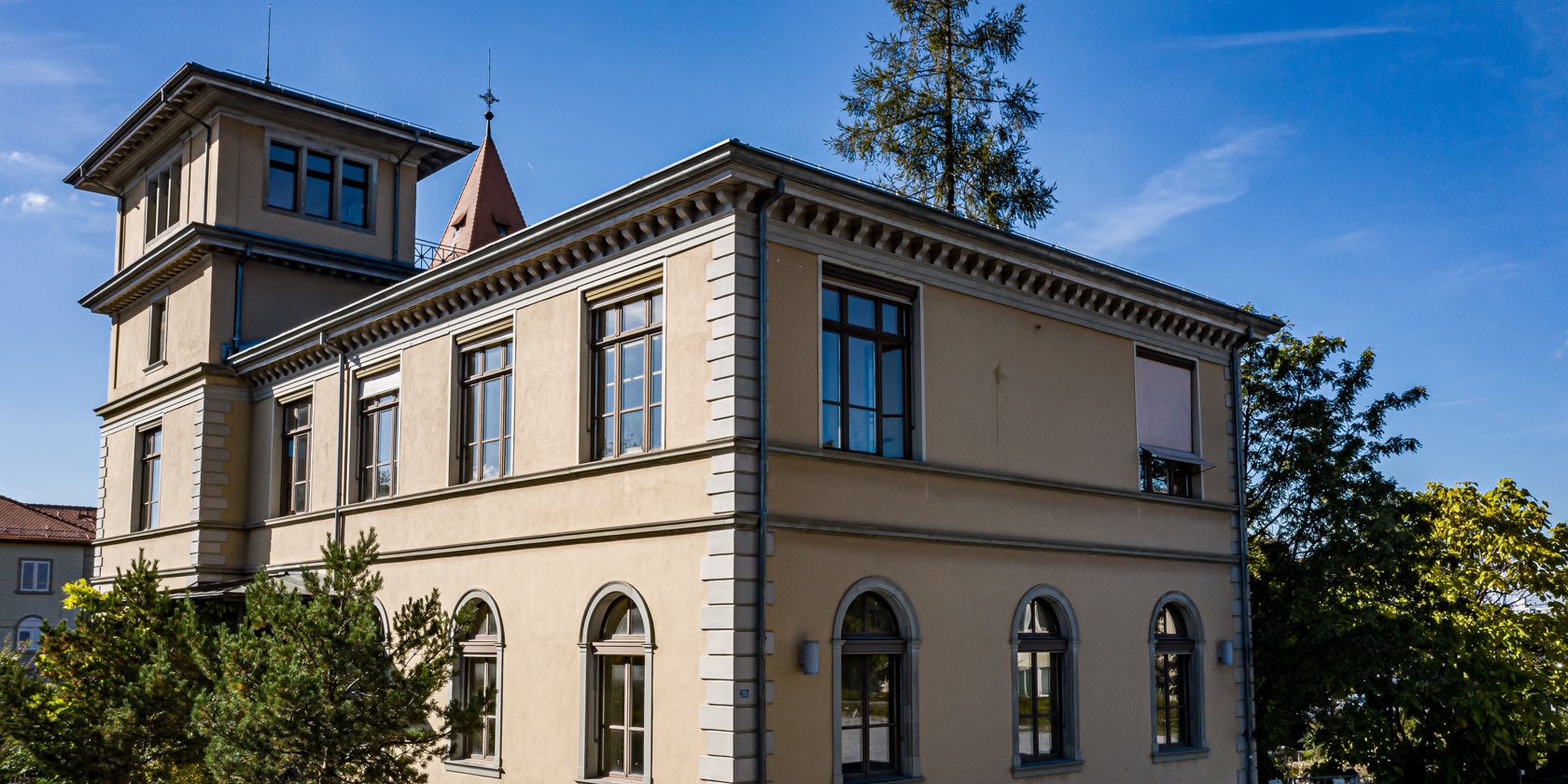 Der Kantonsrat bewilligt 1894 einen Kredit von Fr. 90`000, um ein Gebäude für "Musik, Zeichnen und physikalische Beobachtungen" zu errichten. Das „untere Schulhaus“ wird 1895 gebaut. Die „italienische Villa“ im Jugendstil dient der Schule seither als „Musentempel“. Hier sind die Fachschaften Bildnerisches Gestalten, Werken, Musik und Sologesang untergebracht. Das Gebäude wurde 1989 einer umfassenden Renovation unterzogen. Dabei wurde die Inneneinrichtung des grossen Zeichensaales im ersten Stock unter denkmalpflegerischen Auflagen aufwändig restauriert. Von der Dachterrasse der Villa geniesst man einen weiten Ausblick über die Schulanlage, den Küsnachter Dorfkern und das untere Seebecken bis hin zu den Alpen.
